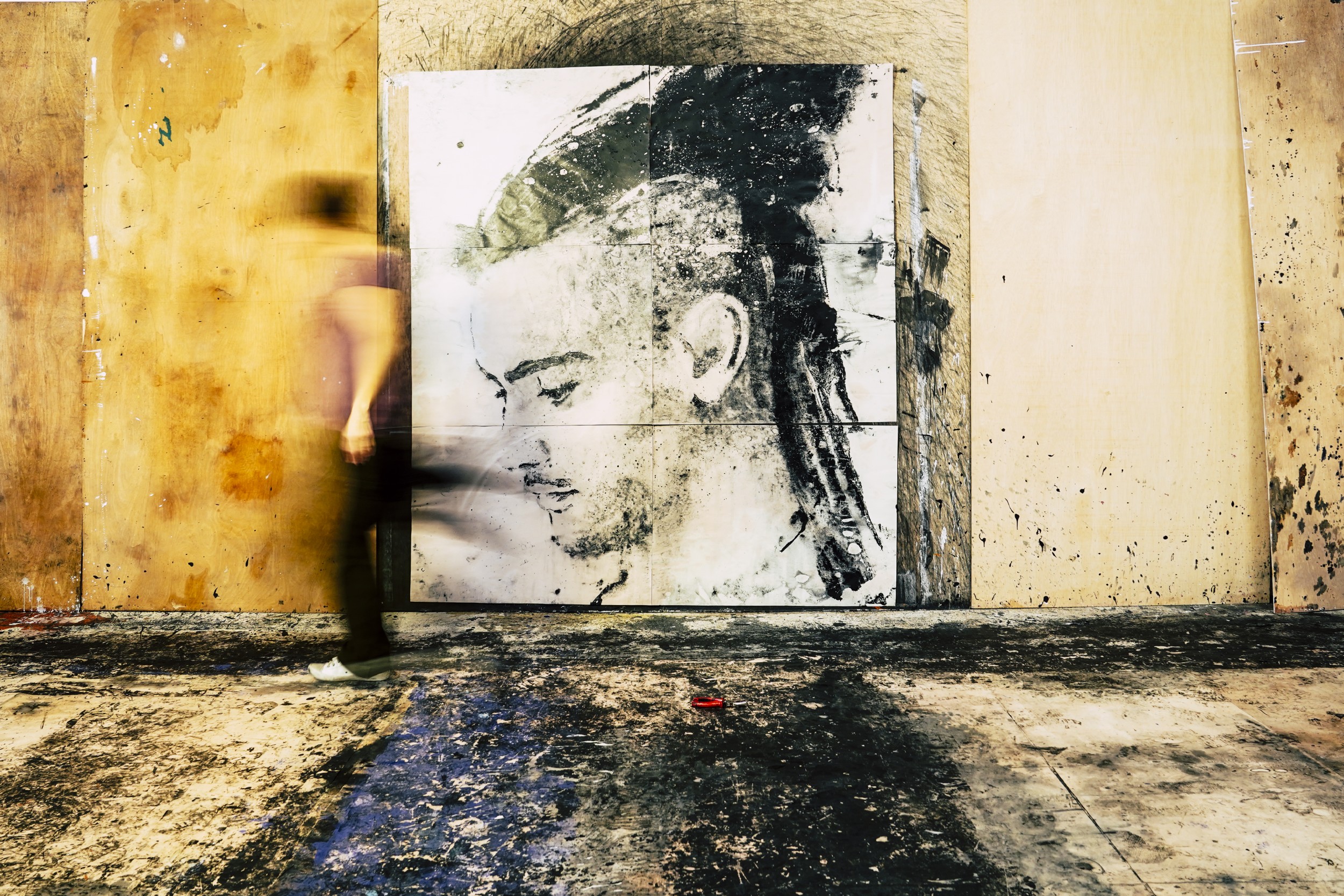 Pintura acrílica negra, plàstics, escombres, baietes i draps són els companys de viatge de l’artista i donen vida a tones de paper reciclat.