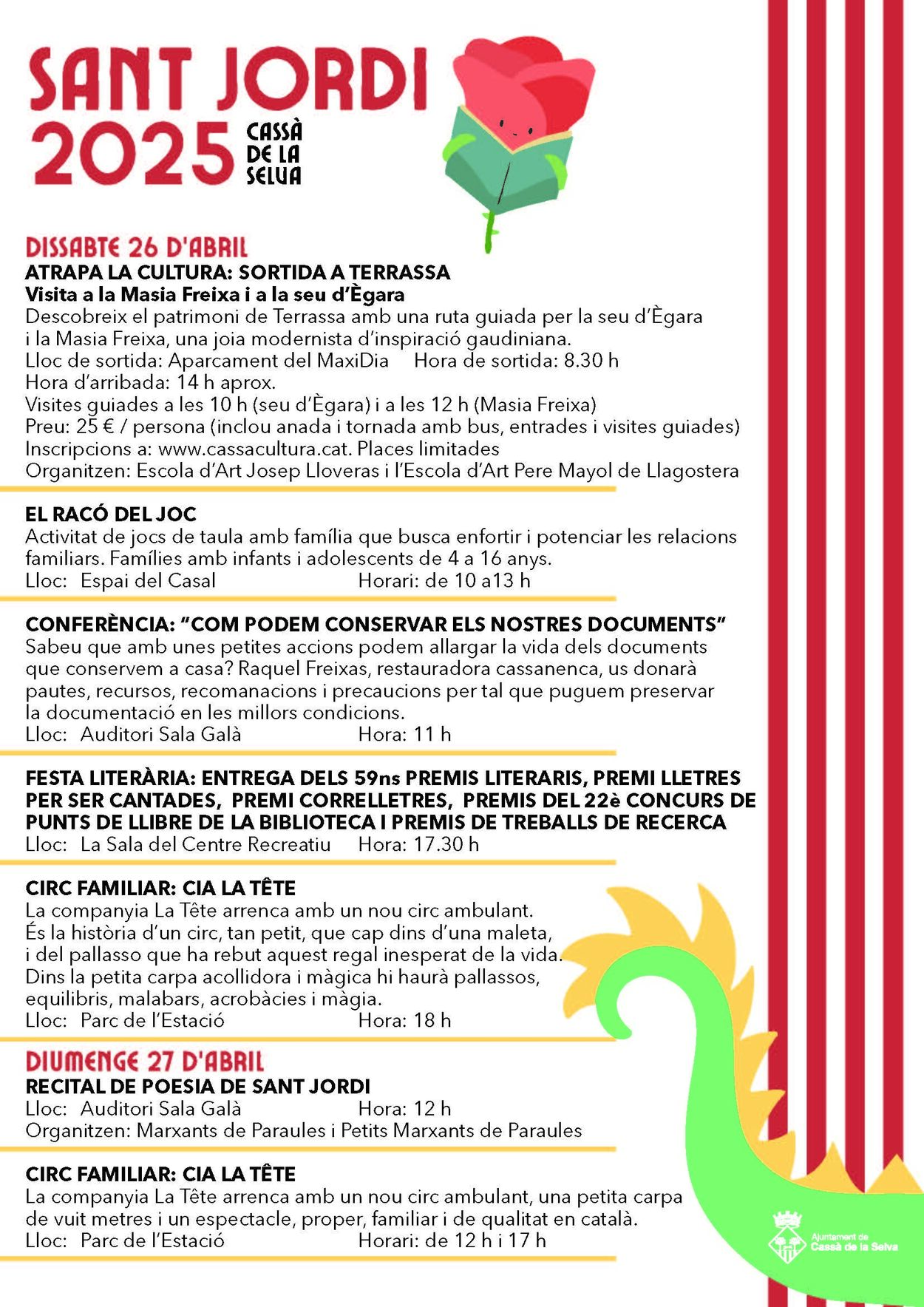 A continuació trobareu totes les activitats que s'han programat a Cassà de la Selva amb motiu de la Diada de Sant Jordi, a partir de dimecres, us desitgem que gaudiu d'una bona Diada!