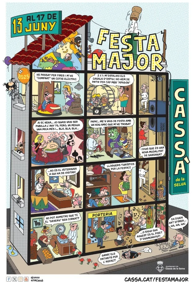 Aquest migdia hem conegut el que serà el programa de la Festa Major de 2025, encapçalat pel cartell que enguany fa una mirada sorneguera a l’imaginari del còmic, del “13, Rue del Percebe” dibuixant tots els protagonistes de la Festa Major de Cassà dins l’històric edifici de Francisco Ibáñez. Hi trobem els gegants, els capgrossos, els Corks, la Nit dels Músics o les fires com a inquilins de les seves vinyetes, us animem a trobar tots els personatges que hi conviuen!