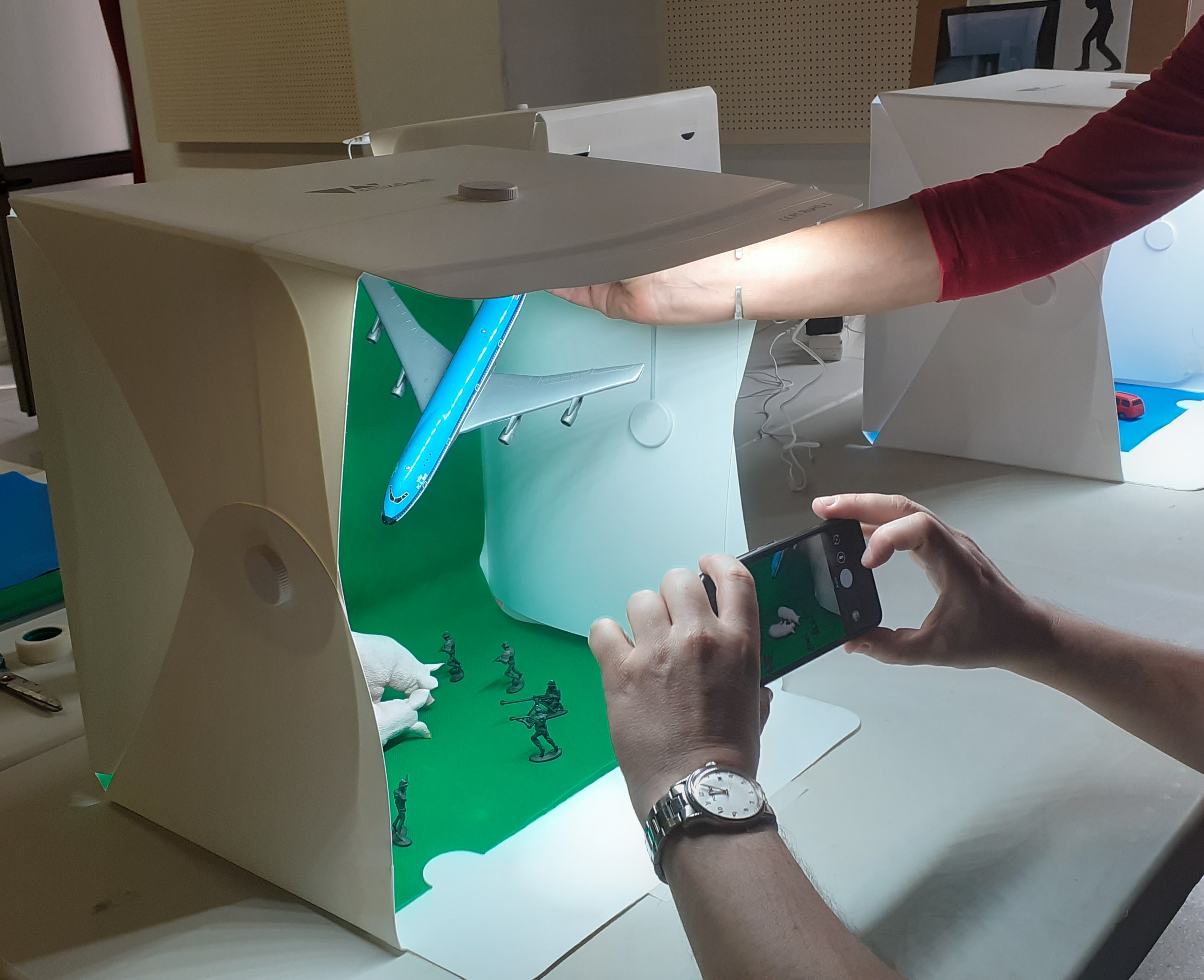 Cada persona selecciona i manipula els objectes dispoinibles col·locant-los dins les caides de llum per a expressar la seva història. En finaltzar, fotografiarà el resultat.